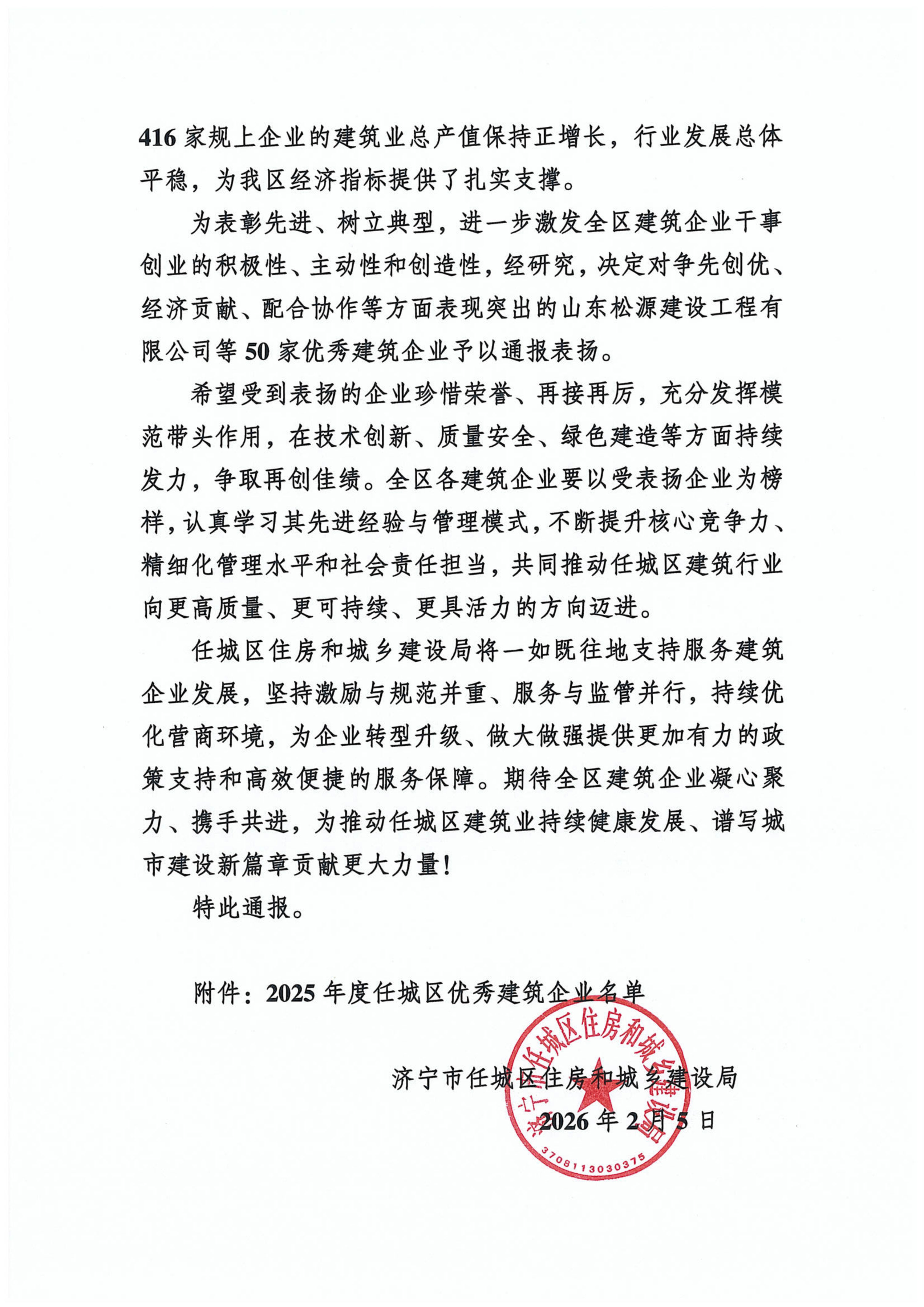 2026年2月5日,山东禹鼎控股集团有限公司荣获济宁市任城区住房和城乡建设局授予的2025年度任城区优 秀建筑企业称号并获通报表扬。
