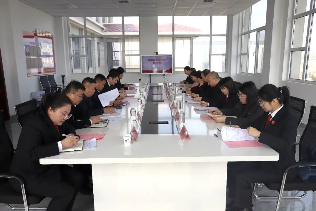 活动期间,水源地司法保护专题座谈会在东阿法院牛角店法庭召开。会上,市中院介绍全市法院水资源保护情况,东阿法院汇报环资及水源地保护工作成效。聊城水务集团作为供水保障主体,围绕水源地日常管护、水质监测、风险排查等工作交流发言,并结合供水实际,就完善联防联控机制提出建议,各参会单位深入研讨保护难点,凝聚“司法护航、政企协同”的保护共识,市中院副院长周公法作总结发言并对后续工作提出要求。
