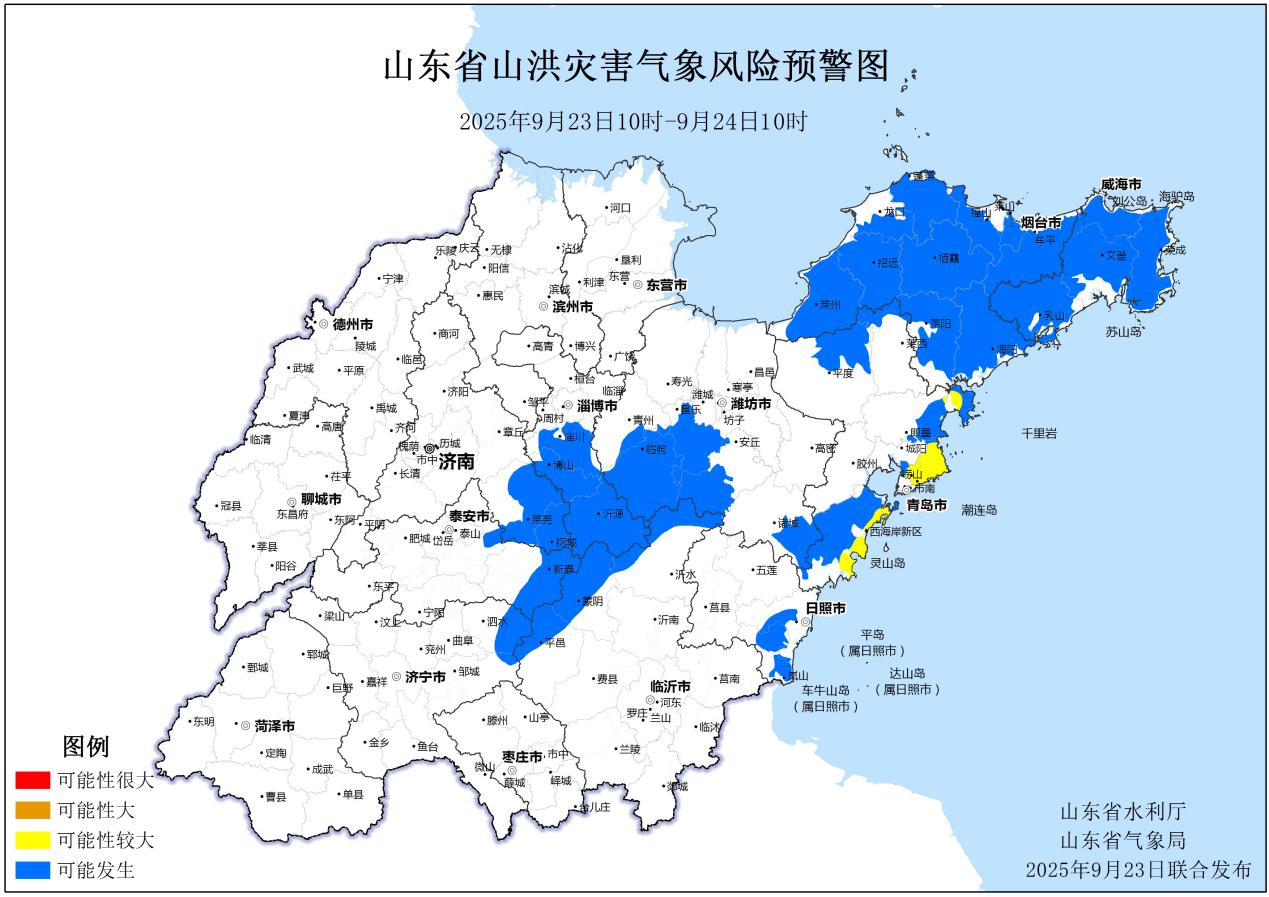 预计92310时至92410时,青岛市局部地区发生山洪灾害的可能性较大(黄色预警),济南、青岛、淄博、烟台、潍坊、济宁、泰安、威海、日照、临沂等市局部地区可能发生山洪灾害(蓝色预警)。
