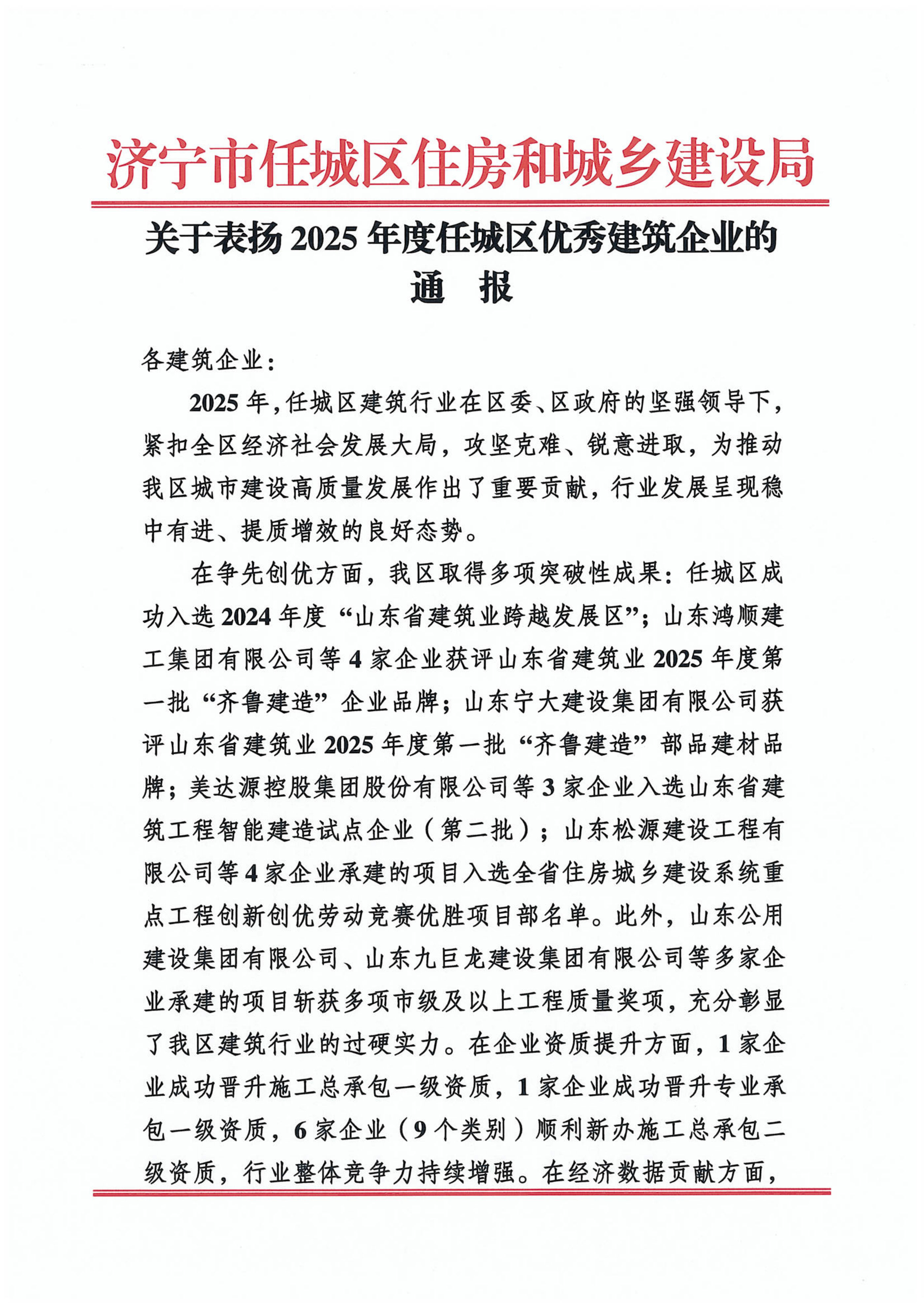 2026年2月5日,山东禹鼎控股集团有限公司荣获济宁市任城区住房和城乡建设局授予的2025年度任城区优 秀建筑企业称号并获通报表扬。