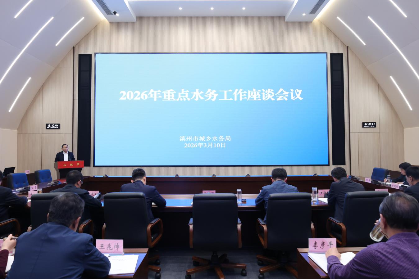 3月10日,滨州市城乡水务局召开2026年重点水务工作座谈会议,37个单位、科室负责同志围绕“服务提升年”重点工作谈思路、谈打算、谈措施。党组书记、局长、一级调研员潘清军参加会议并讲话,党组副书记、三级调研员张统亮主持会议,党组成员、副局长李栋、刘道义参加会议。