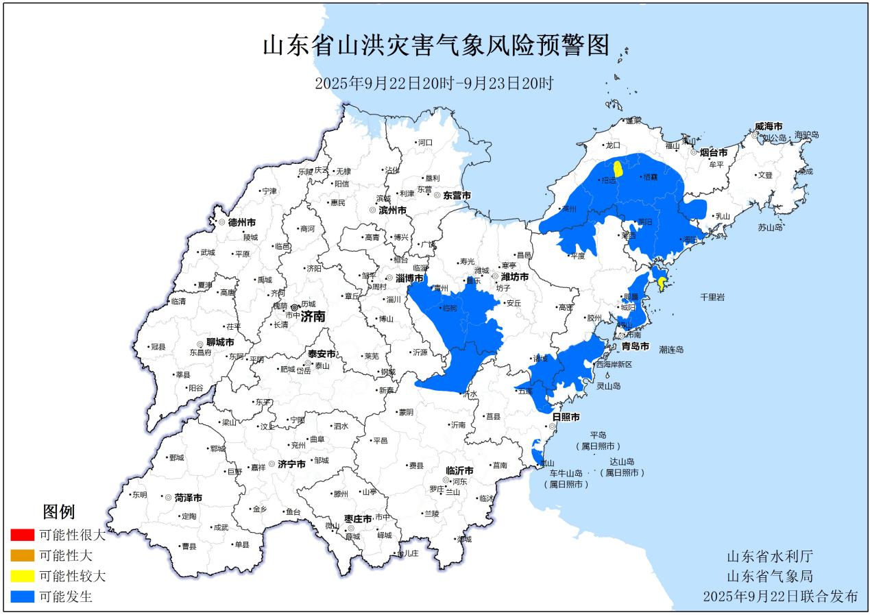 预计9月22日20时至9月23日20时,青岛、烟台等市局部地区发生山洪灾害的可能性较大(黄色预警),青岛、烟台、潍坊、威海、日照、临沂等市局部地区可能发生山洪灾害(蓝色预警)。